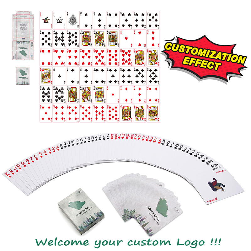 •1 Deck (54 Karten) oder 2 Decks (108 Karten) nach Auswahl (Standard- oder benutzerdefiniertes Design).